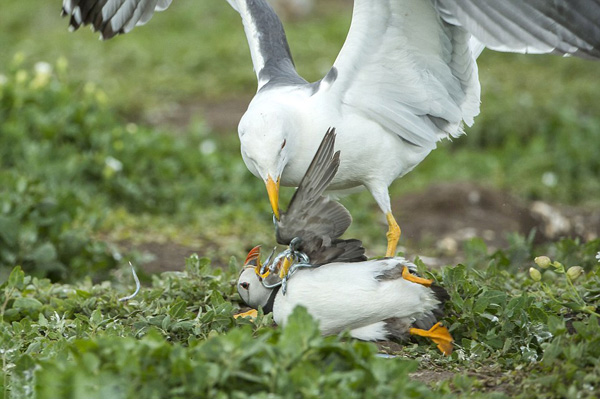 当时,威尔看到一只黑背鸥全速追击一只慌乱逃跑的海鹦,眨眼间的功夫,黑背鸥便将海鹦制服在地,硬生生地将海鹦嘴里的玉筋鱼抢了过去。海鹦没有受皮外伤,但自尊可能遭到了践踏。