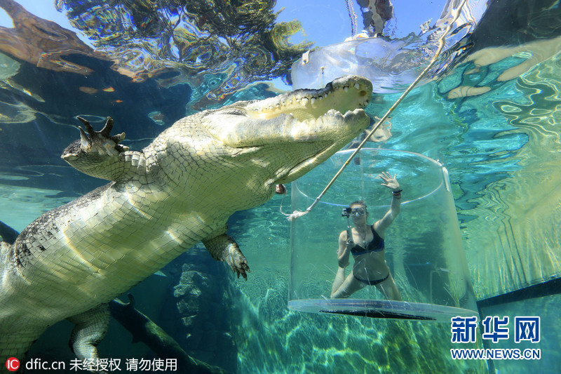 2016年6月27日报道,26岁的加拿大女子弗兰妮(Franny Plumridge)身穿比基尼,藏身在水下一个透明的笼子中,近距离接触一条17英尺的巨型盐水鳄,尽管这头鳄鱼仅仅距离弗兰妮只有几厘米,但她并未感到恐惧,看着这个巨型的家伙从自己的身边游过,弗兰妮反而是兴奋不已。图片来源:东方IC