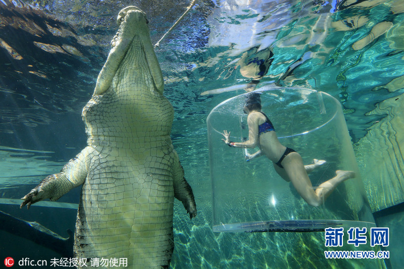 2016年6月27日报道,26岁的加拿大女子弗兰妮(Franny Plumridge)身穿比基尼,藏身在水下一个透明的笼子中,近距离接触一条17英尺的巨型盐水鳄,尽管这头鳄鱼仅仅距离弗兰妮只有几厘米,但她并未感到恐惧,看着这个巨型的家伙从自己的身边游过,弗兰妮反而是兴奋不已。图片来源:东方IC