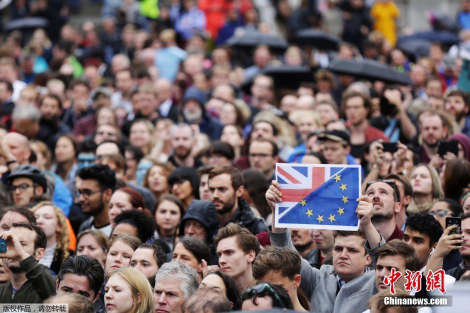 地时间2016年6月28日,英国伦敦,大批民众持标语和旗帜在伦敦市中心集会示威,要求“留欧”。