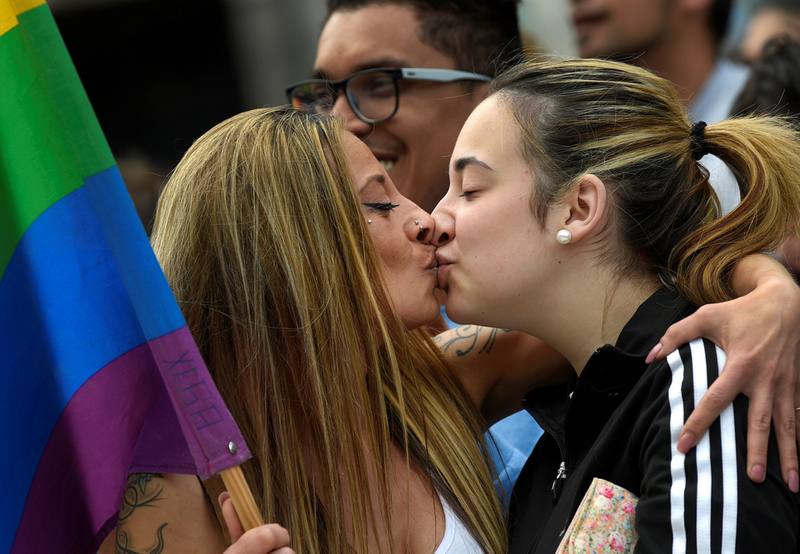 西班牙奥维耶多,当地举行同性恋大游行,一对情侣当街热吻。CFP视觉中国