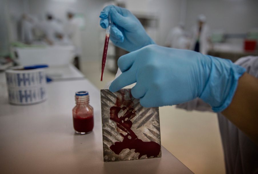 6月22日,一名实验室技术人员将动物血泼在一块热的盘子上,用来喂养蚊子。