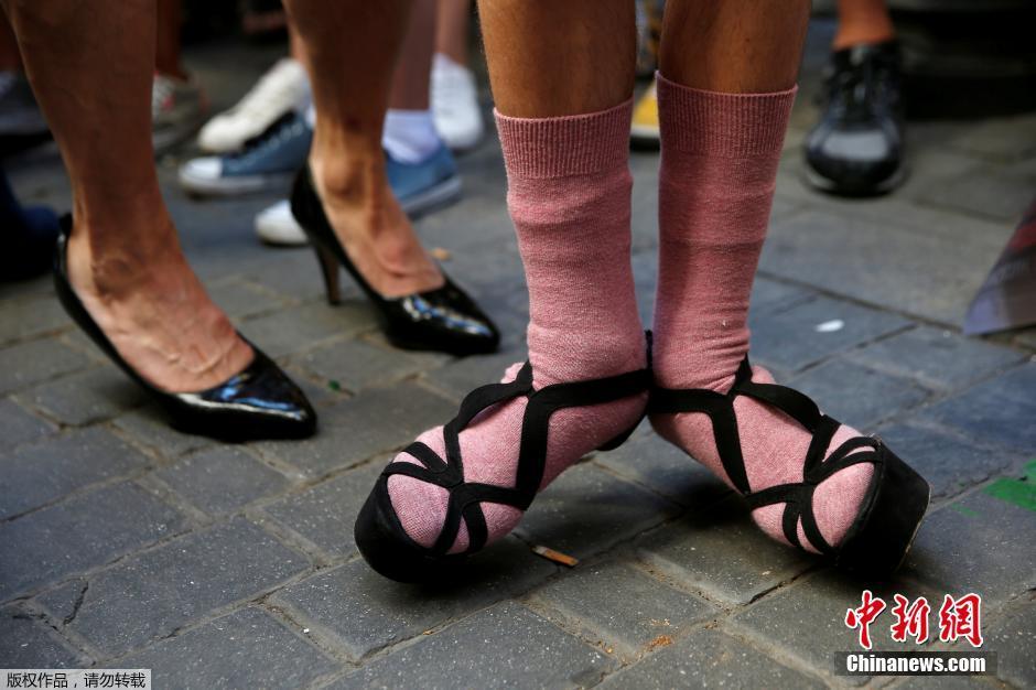 当地时间6月30日,西班牙马德里,高跟鞋赛跑活动举行,参与者穿着高跟鞋参与比赛,一些男士甚至穿着裙子体验“恨天高”。