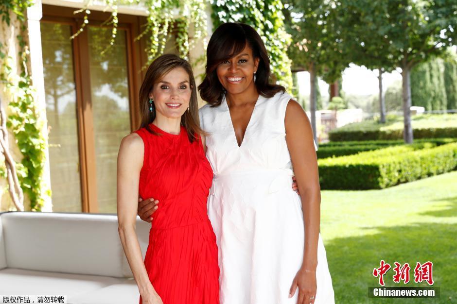当地时间2016年6月30日,西班牙马德里,美国第一夫人米歇尔和西班牙王后莱蒂齐亚散步聊天,席间二人搂腰亲密合影。米歇尔在西班牙访问期间发表演讲,推广“让女孩学习”项目。