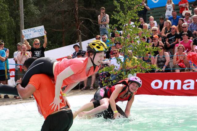 7月2日,在芬兰松卡耶尔维,参加“背媳妇”比赛的选手在奋力奔跑。(新华社记者李骥志摄)