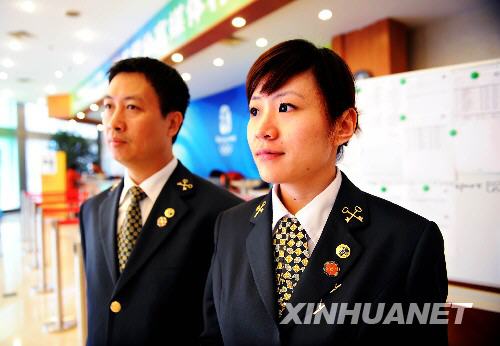 资料:2008年8月7日,来自深圳的“金钥匙”朱莹(右)在北京汇园公寓奥运媒体村值班。新华社记者李紫恒摄