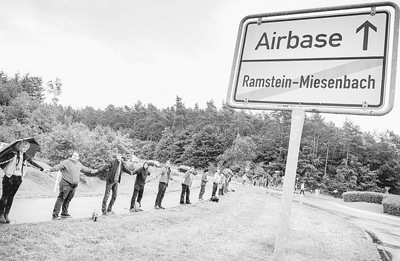 今年6月,数千名德国反战人士在美军拉姆施泰因空军基地外排成人墙,抗议美国在他国的武装无人机作战造成无辜平民死伤。