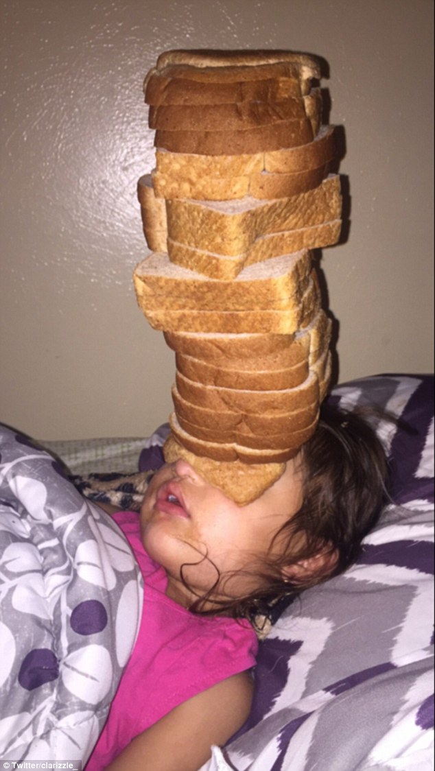 一开始,克莱尔只是将切片面包最边上的那一片放在了妹妹的脑门上,但是这个举动丝毫没有打扰到睡得正香的妹妹。于是克莱尔大胆起来,在妹妹的脑袋上又放了14片面包。然而有谁料到,顶着“一脸”面包的妹妹仍然睡得香甜。于是克莱尔索性把这个恶作剧做到底:把剩下的切片面包一并堆到妹妹的脸上,于是就有了这张照片。