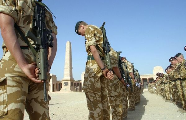 2003年11月9日,在伊拉克巴士拉以南20公里的一座战争纪念碑前,英国士兵在一年一度的“荣军纪念星期日”活动中列队默哀两分钟 。(新华/法新)