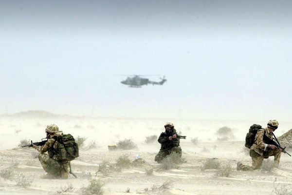 2003年3月25日,在伊拉克南部油田附近的沙漠中,几名英国士兵冒着沙尘暴巡逻。 (新华社/法新)