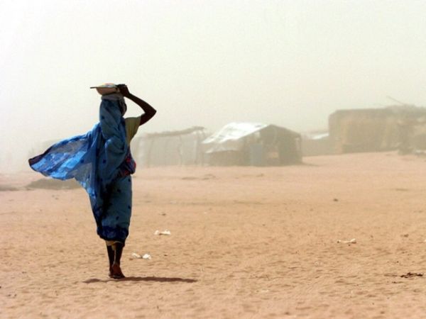 2006年1月21日,在苏丹西部的达尔富尔地区,一名身披蓝纱的少女在黄沙中穿行。(新华社记者杨磊摄)