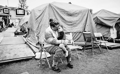 根据美国的官方统计,全美贫困人口约有4670万,占人口总数的15%。图为在美国西雅图,一位失业者抱着自己的孩子坐在帐篷城里。这座帐篷城由民间组织管理,专为无家可归的穷困人群提供住所。