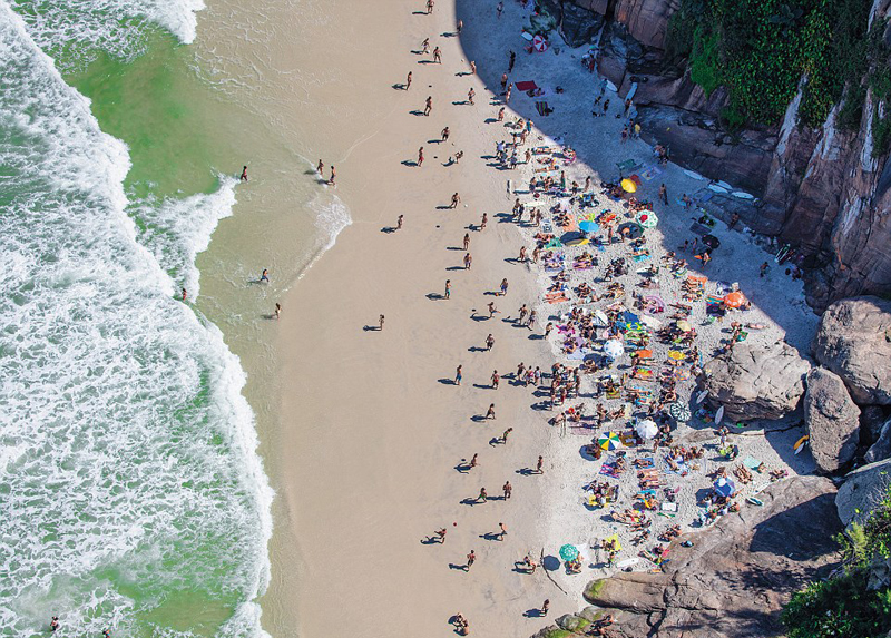整齐排列的各种花型遮阳伞、在沙滩尽情享受日光浴的游客、透明的蓝绿色的大海。格雷在这5年里探访了巴西和南非等地,他勇敢探身直升机无门机舱外,手持相机拍摄下了一系列的美好海滩画面。