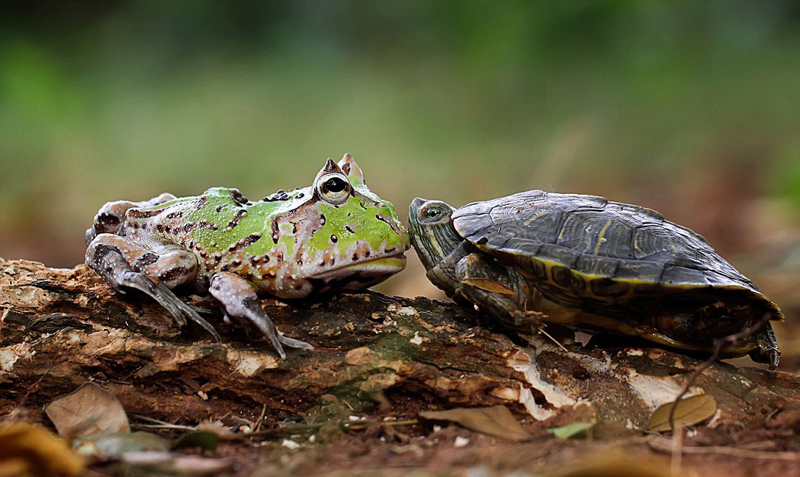 起初,青蛙小心翼翼地靠近乌龟,打量着它的大小,想要让它送自己一程。在看到乌龟没有反对意见后,这只懒惰的青蛙便爬至乌龟背部,搭起了便车。