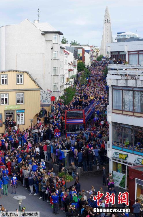2016年7月4日,冰岛雷克雅未克,冰岛男足欧洲杯创历史,众将士回国后坐大巴游行,举国欢庆。