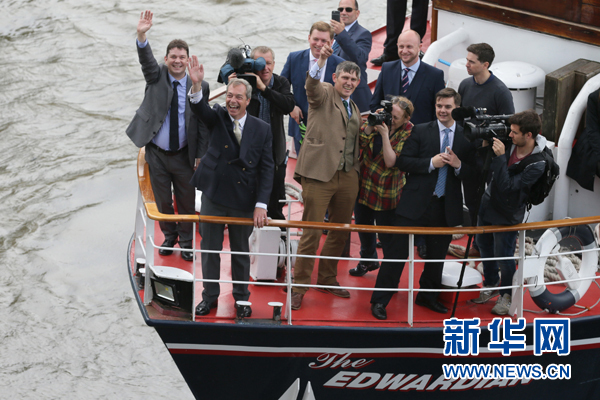 6月15日,在英国首都伦敦泰晤士河上,主张脱欧的英国独立党领导人奈杰尔·法拉奇(左二)在一艘“脱欧派”渔船上参加造势活动。新华社发