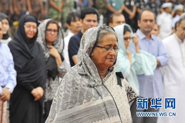7月4日,在孟加拉国首都达卡,孟加拉国总理哈西娜(前)悼念劫持人质事件遇难者。新华社发
