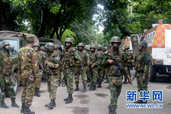 7月2日,在孟加拉国首都达卡,军队士兵在救援行动中待命。新华社发