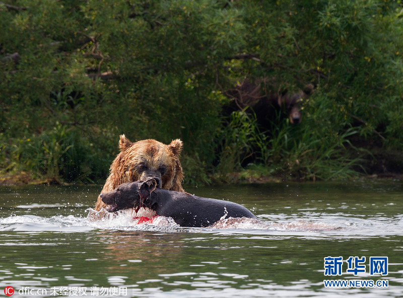 2016年7月5日报道(具体拍摄时间不详),俄罗斯库页湖,一头约9英尺的雄性成年堪察加半岛棕熊在河水中攻击了一头3岁大的幼熊,可怜的幼熊只挣扎了一会儿就被咬伤,并被拖上了河岸,最终被咬死吃掉。34岁的莫斯科数学家Mikhail Korostelev在当地观熊时拍下了这罕见的屠杀画面。 (图片来源:东方IC)
