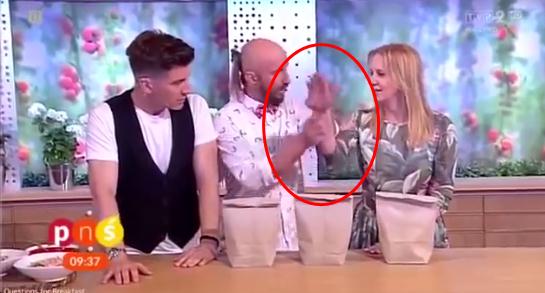 魔术师抓起女主持人罗加尔斯卡(Marzena Rogalska)的右手教她大力拍纸袋。