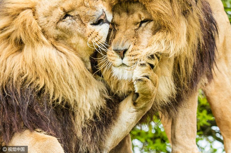 2013年6月17日消息,英国肯特郡阿什福德市的野生动物遗产基金会里,一头雄狮向兄长献吻。barcroftmedia/视觉中国