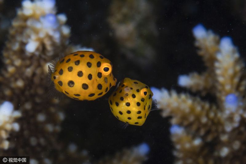 2014年3月10日消息,留尼汪岛,两条黄色的盒子鱼“忘情”亲吻彼此。这一令人惊艳的水下摄影,记录了两条盒子鱼大玩亲亲的瞬间。Yann Oulia在潜水时捕捉到这一瞬间。barcroftmedia/视觉中国