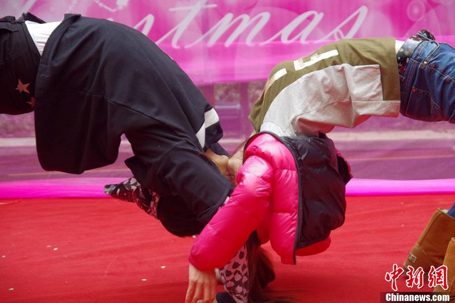 泰国情侣赢在了时间上,中国情侣赢在了姿势上,很担心他们真的不会岔气么。图为12月24日,湖北省武汉市,在一美食休闲广场举办“圣诞之吻情侣KISS大赛”,参赛情侣经自选动作、指定动作和爱的表白,获胜者将赢得1.5万的物资奖品,吸引不少情侣参赛。