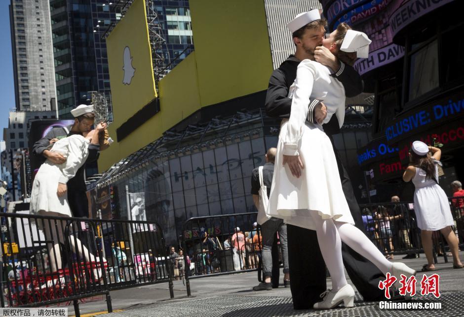 提到接吻,不得不提到这个被历史铭记的一幕,在当地时间1945年8月14日(北京时间8月15日)的纽约时代广场,时值日本宣布无条件投降,纽约民众纷纷走上街头庆祝胜利。一位水兵在时代广场的欢庆活动中亲吻了身旁的一位女护士,这一瞬间被《生活》 杂志的摄影师阿尔弗雷德·艾森施泰特抓拍下来,成为传世的经典历史画面。 当地时间2015年8月14日,美国纽约,情侣穿着水兵和护士的服装在时代广场接吻,重现“胜利日之吻”,纪念二战结束70周年。