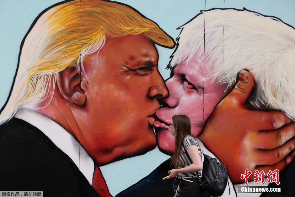 “脱欧”成功后,被推到风口浪尖上的还有一直支持脱欧的前伦敦市长鲍里斯,曾以为他会竞选英国新任首相,但他就是让人如此捉摸不定,鲍里斯先生郑重宣布不参加竞选了。图为当地时间2016年5月24日,一面墙上的涂鸦画着美国总统候选人特朗普亲吻伦敦前市长鲍里斯,两个在世人眼中都是不走寻常路的政坛人物,此刻被联系在了一起。