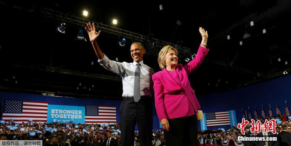 当地时间2016年7月5日,美国北卡罗来纳州夏洛特,美国总统奥巴马首次助阵民主党总统候选人希拉里的竞选集会。据悉,奥巴马和希拉里的关系进入了新的“共生”阶段,希拉里要靠奥巴马的影响力来提高支持率,而奥巴马助希拉里获选可以增加自己的政治遗产。从现在开始的四个月中,这对化敌为友的搭档要不断向公众推销对方。