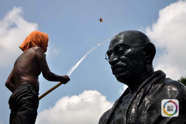 2015年10月1日,在印度布巴内什瓦尔,一名工人清洗甘地的雕像。 (新华社/法新)