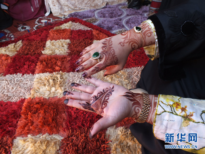 汉娜花手绘被认为是流行于阿拉伯地区,尤其是以阿联酋为代表的海湾地区的一种女性美体、美容的民间艺术。汉娜是千屈菜科散沫花属的灌木,是散沫花叶经过烘干,杀菌,研磨成的纯天然的植物粉末,用于纹身、彩绘以及头发、指甲等的染色。深受阿拉伯和印度等地人的喜爱。(本组图片由新华网记者安江、马锡平摄)