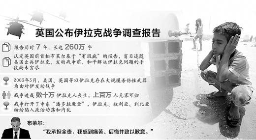 经过长达7年的调查,英国官方组建的伊拉克战争调查委员会6日公布调查报告。这份长达260万字的调查报告认为,英国作出伊拉克战争的决策是基于“有瑕疵”的情报和评估,在发动战争之前,解决伊拉克问题的和平手段并未穷尽,军事行动并非当时万不得已的手段。报告指出,发动伊拉克战争的决定不正当,时任英国首相布莱尔对伊战负有不可推卸的责任。