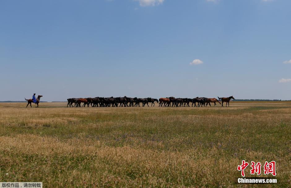 当地时间2016年6月29日至30日,匈牙利霍尔托巴吉,古老的牧民在匈牙利大平原上牧马。