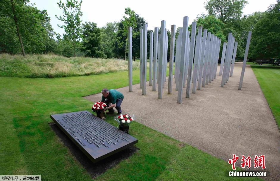 当地时间2016年7月7日,英国伦敦,民众向海德公园七七伦敦爆炸受害者纪念碑献花。