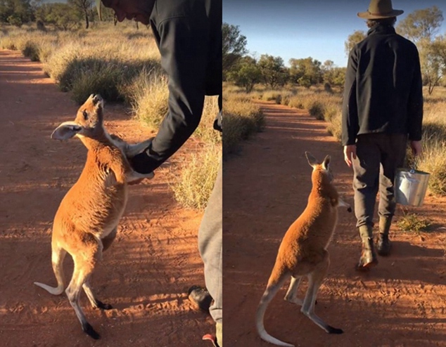 这只袋鼠宝宝名为约翰森(Johannsen),住在澳大利亚艾利斯斯普林斯的袋鼠避难所。它的主人叫克里斯·巴恩斯(Chris Barns)。巴恩斯和他的袋鼠们是BBC《袋鼠邓迪》节目的人气明星。视频中,约翰森抓着主人不放,好像不舍得离开主人。而主人一直在承诺约翰森说:我会回来的。”巴恩斯还弯下腰对约翰森说:“没关系,我不会离开你的。”约翰森短暂地放手后,又一路跳着跟着主人。