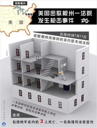 新华社芝加哥7月11日电(记者徐静)美国密歇根州西南部的圣约瑟夫城法院11日下午发生枪击事件,造成包括枪手在内的3人死亡、一名助理司法官受伤。