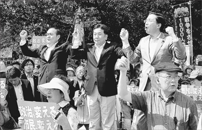 日前,日本国会周边再度爆发大规模反安保法案民众集会。图为在日本东京,社民党、民进党、共产党等多名日本在野党派高层人士联手与会助阵。