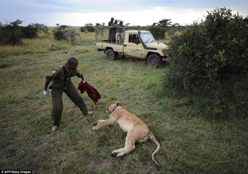 待镇静剂在雌性狮子体内发挥药效后,一名野生动物管理员接近它。