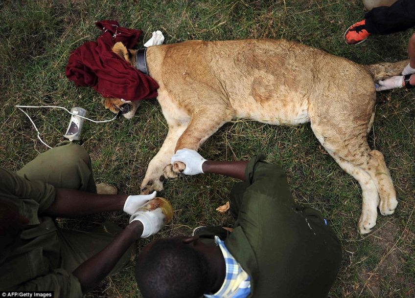 雌性狮子完全镇静后,兽医立马开始了对它的治疗,并在它的颈部带上了无线电项圈用来监控它的状况。