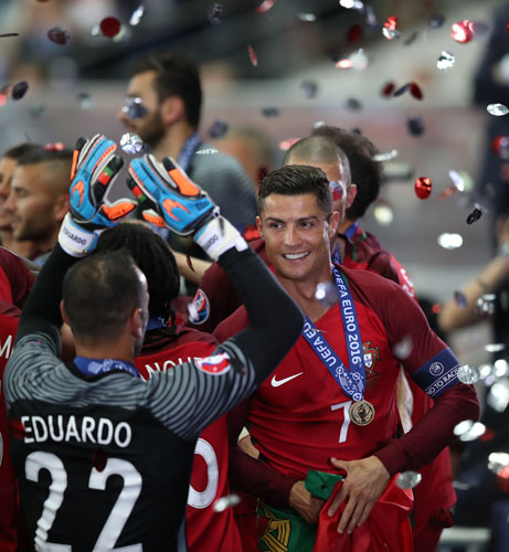 7月10日,葡萄牙队球员克·罗纳尔多(右)在夺冠后和队友庆祝。当日,在法国巴黎进行的2016年欧洲足球锦标赛决赛中,葡萄牙队以1比0战胜法国队,夺得冠军。新华社记者白雪飞摄