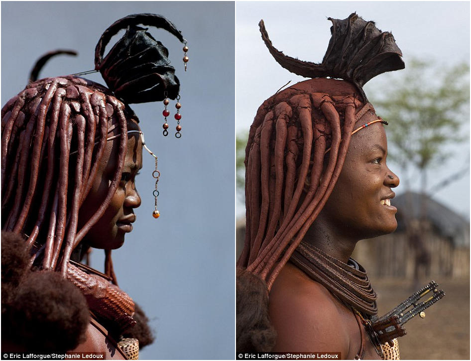 婚后一年或是有了第一个孩子后,辛巴族妇女会用一枚精致的兽皮头饰来装扮自己。摄影师埃里克告诉我们,这里的女子每天要花数个小时来打扮自己,为避免弄乱发型,她们晚上枕木枕睡觉。