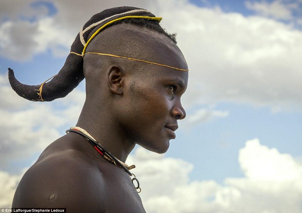 与女子相比,辛巴族男子的发型要简单得多。结婚前,男孩儿们通常扎着独辫。结婚后,男人们会用头巾将头发裹起来,这一头巾将陪伴他们终生。