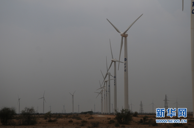 耸立在巴基斯坦南部信德省贾姆皮尔地区的巴风一期风车。由中国长江三峡集团公司在巴基斯坦南部信德省贾姆皮尔地区投资建设的风电一期工程(简称巴风一期)于2013年1月开工建设,2014年11月正式投入商业运营。巴风一期安装1.5兆瓦风力发电机组33台,年发电近1.4亿度,可满足当地6万多个家庭的用电需求。在中巴经济走廊下优先安排了一批新能源项目。这些项目建设周期短、见效快,可为严重缺电的巴基斯坦解决燃眉之急。 新华网发(艾哈迈德·卡迈勒摄)