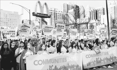 2016年4月14日,美国芝加哥,大批当地民众组织游行,要求将美国全境的最低时薪提高至15美元,改善低收入群体的生活条件。人民视觉