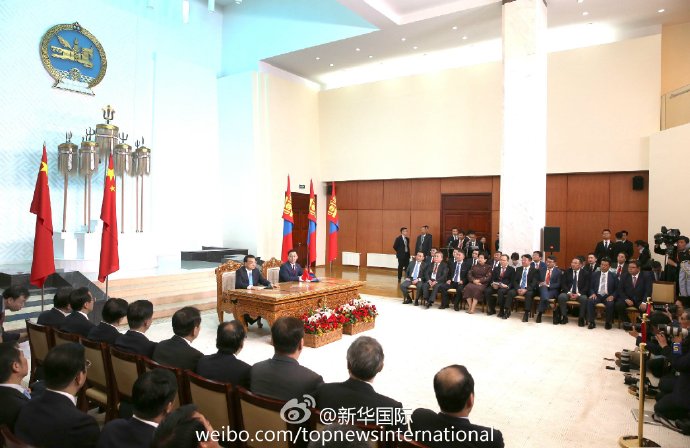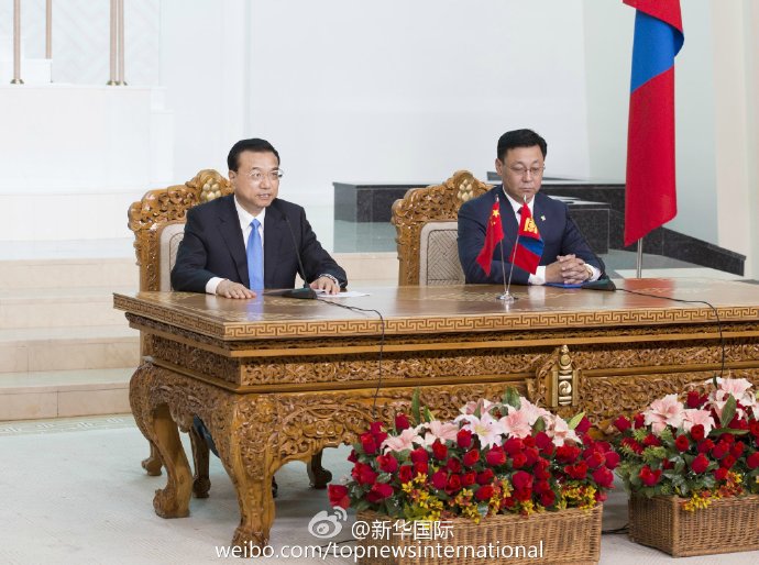 新华网北京7月14日电 7月14日,李克强与额尔登巴特在乌兰巴托国家宫共见记者。双方表示愿保持两国关系发展正确方向,尊重彼此核心利益和重大关切。双方同意加快推进中方“一带一路”与蒙方“草原之路”战略对接,希望加强畜牧业加工和住房建筑等领域的合作。 (据新华社“新华国际”微博报道)