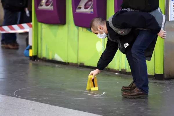 在法国巴黎西北部的拉德方斯商业区,警方在袭击现场调查。