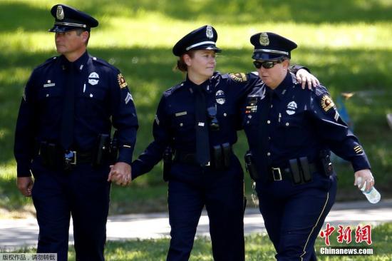 资料图:当地时间2016年7月13日,美国达拉斯,此前在枪击事件中遇难的警察葬礼举行。7月7日,在达拉斯举行的反警察执法暴力和种族歧视活动期间,一名男子向警察射击,导致5名警察死亡,7名警察和2名平民受伤。