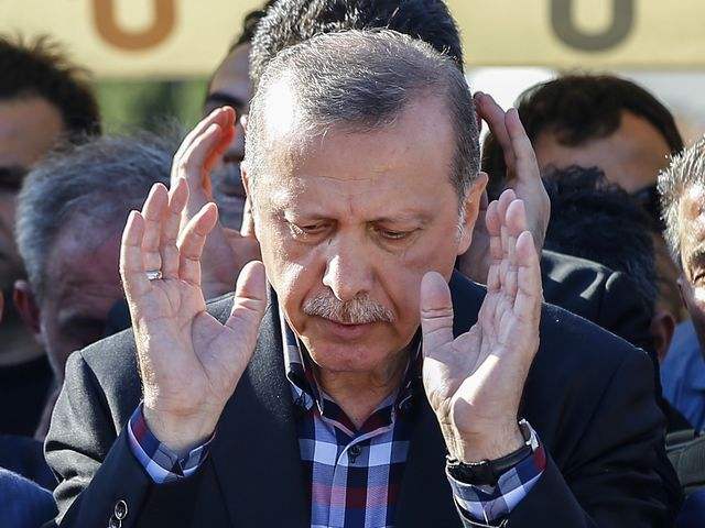 7月17日,土耳其总统埃尔多安在其竞选经理奥尔卡克父子的葬礼上祷告。