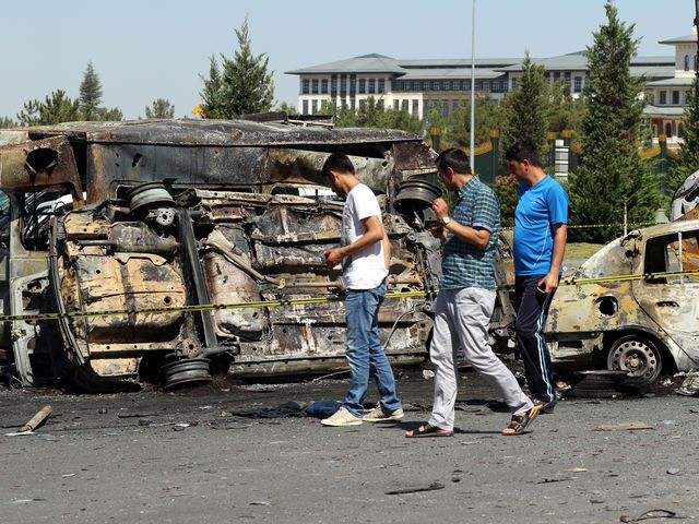 安卡拉总统府附近,行人查看着汽车残骸。